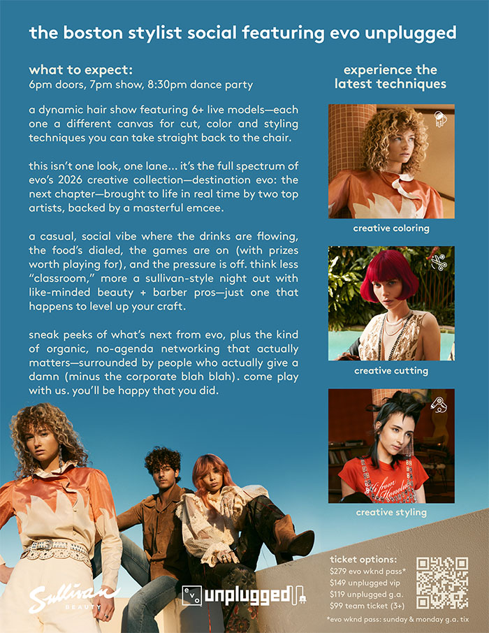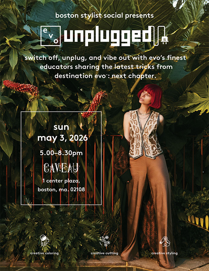switch off, unplug and learn the latest hair tricks from evo’s crème de la crème creative team. are you ready to unplug from the noise and leave the ordinary behind? come along to a night with evo, hosted by the incomparable Belinda Mills & Sam Kane. watch and learn from the best of the best as our educators showcase looks from evo’s creative collection, covering everything the evo-verse has to offer, including colouring, cutting and styling. there will be: eats, drinks, sneak peeks of what’s to come from evo and plenty of like-minded people to connect with (minus the corporate blah blah). there won’t be: snore-worthy loooong presentations about things you already know. we’ll be dishing up the good times, good techniques and good vibes only. Tickets: - General Admission — $119.00 - VIP Experience — $149.00: Includes swag bag + VIP seating (no group rate) - evo Weekend Pass — $279.00: Includes Both Events: Boston Stylist Social + Perfect Shot *Best Value - Team Ticket (3+) — $99.00 *Please contact your S.B.C. or Customer Care to place your Team Ticket order: 844-799-0811 *Easy access to parking and public transit surrounding the venue. *Alcohol will be available for 21+ Under 21 years old will be allowed to attend.