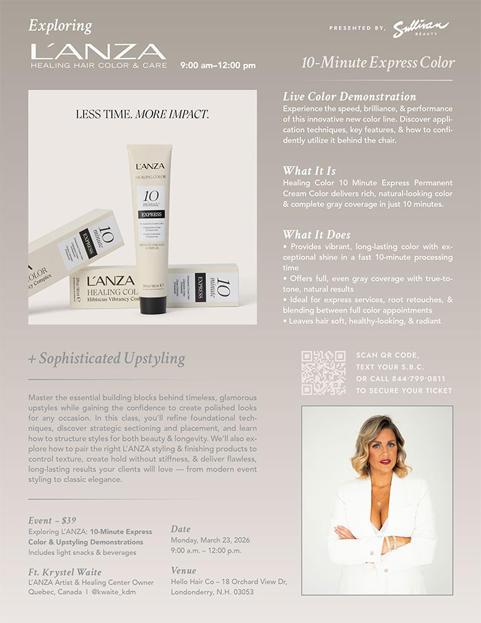 What It Does • Provides vibrant, long-lasting color with ex- ceptional shine in a fast 10-minute processing time • Offers full, even gray coverage with true-to- tone, natural results • Ideal for express services, root retouches, & blending between full color appointments • Leaves hair soft, healthy-looking, & radiant Master the essential building blocks behind timeless, glamorous upstyles while gaining the confidence to create polished looks for any occasion. In this class, you’ll refine foundational tech- niques, discover strategic sectioning and placement, and learn how to structure styles for both beauty & longevity. We’ll also ex- plore how to pair the right L’ANZA styling & finishing products to control texture, create hold without stiffness, & deliver flawless, long-lasting results your clients will love — from modern event styling to classic elegance.